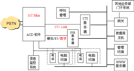 通過CTI Link M1D軟件,實現(xiàn)CTI服務(wù)器與11C Mini交換機之間進行呼叫狀態(tài)傳遞和呼叫控制,支持北電ACD、CDN等先進排隊技術(shù)。同時還為客戶端提供CTC