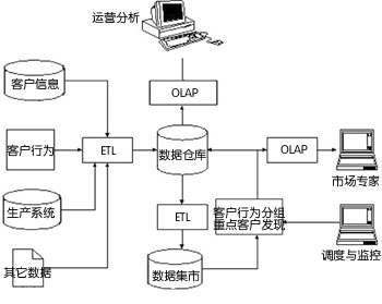 數(shù)據(jù)主要有四個方面的來源:客戶信息、客戶行為、生產系統(tǒng)和其它相關數(shù)據(jù)。這些數(shù)據(jù)通過抽取、轉換和裝載過程,形成數(shù)據(jù)倉庫,并通過OLAP和報表,將客戶的整體行為分析和企業(yè)運營分析等傳遞給數(shù)據(jù)倉庫用戶。