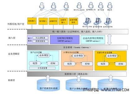其中,外圍系統(tǒng)/用戶層主要指系統(tǒng)相關(guān)的外圍系統(tǒng),以及業(yè)務(wù)受理、系統(tǒng)管理、綜合查詢、繳費(fèi)、統(tǒng)計(jì)報(bào)表、帳務(wù)管理等與客戶或操作人員交互的應(yīng)用系統(tǒng)界面。接入層為最終客戶提供統(tǒng)一的客戶接觸、服務(wù)平臺(tái),為各個(gè)營(yíng)銷渠道服務(wù)人員提供良好的工作平臺(tái),支撐其為客戶提供優(yōu)質(zhì)服務(wù),同時(shí)為其它外圍系統(tǒng)和機(jī)構(gòu)提供實(shí)時(shí)、定時(shí)批處理接口。業(yè)務(wù)邏輯層(應(yīng)用層)是系統(tǒng)的最核心部分,它接收來(lái)自表現(xiàn)層的功能請(qǐng)求,是實(shí)現(xiàn)各種業(yè)務(wù)功能的邏輯實(shí)體,如業(yè)務(wù)受理中的業(yè)務(wù)新裝、開(kāi)/停機(jī)、業(yè)務(wù)變更以及話費(fèi)查詢、報(bào)表統(tǒng)計(jì)計(jì)算等。數(shù)據(jù)層用于存放并管理各種系統(tǒng)數(shù)據(jù),如客戶資料數(shù)據(jù)、資源數(shù)據(jù)、銷售數(shù)據(jù)、統(tǒng)計(jì)分析數(shù)據(jù)等。