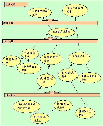 全程全網(wǎng)考核策略目標因果關系圖是"平衡計分卡"應用的重要環(huán)節(jié),在此要特別強調(diào)?因為它是將根據(jù)公司遠景規(guī)劃以及使命確定的四個考核維度轉化為全程全網(wǎng)考核系統(tǒng)進入實際操作階段之關鍵步驟。在平衡記分卡的設計過程中,它起著承前啟后的作用,在構建呼叫中心全程全網(wǎng)考核系統(tǒng)中全程全網(wǎng)考核策略目標因果關系圖的突破性銜接功能-以其邏輯性的架構來界定和描述實現(xiàn)全面績效考核的策略方案。將公司成功、客戶價值、核心流程和呼叫中心核心能力之間的關聯(lián)清晰地呈現(xiàn),并將企業(yè)的策略與其績效衡量系統(tǒng)相銜接。