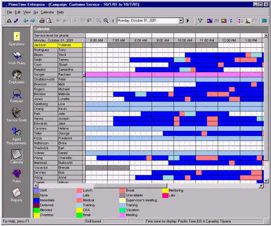 人員預(yù)測是一個(gè)每天、每周、每月、每年都需要作的工作計(jì)劃,為了能夠平衡呼叫中心人員的工作量和人員的可用性。通過將歷史數(shù)據(jù)和人員數(shù)據(jù)整合、加以分析,并借以WFMS體現(xiàn)出分配多少員工就可以達(dá)到既定的服務(wù)水準(zhǔn)。一旦需要員工數(shù)量被估算出來,那么工作安排也就是每天、每周、每月、每天的排班表的輪廓也就出來了。絕大多數(shù)的WFMS軟件的界面和操作都很相似,最主要的就是內(nèi)容就是要包含員工的姓名、員工的工作時(shí)間、員工的其他日程(最小單位是15分鐘),并且能夠提供具有多個(gè)管理軟件接口,和多種不同的管理方式。圖9.就是一個(gè)典型的人員排班表,以15分鐘為單位體現(xiàn)人員的工作安排。附加選項(xiàng)還可以包含"休假""遲到""曠工"等等,并且這排班表還可以通過歷史數(shù)據(jù)體現(xiàn)出哪個(gè)時(shí)段可能出現(xiàn)人員不足哪個(gè)時(shí)段容易出現(xiàn)人員過,F(xiàn)象。