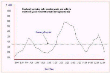 Inbound的來話量成不規(guī)則的波形圖,形成這種不規(guī)則波形圖中波峰和波谷的原因是在這些波峰和波谷工作的員工數(shù)量。(見圖8.來話量的分布圖)這將對在一天中的每個(gè)時(shí)段能夠分配最理想的員工來工作造成了最大的困難。一個(gè)小時(shí)能可能從來話量的波峰到達(dá)波谷,管理人員如何排班來匹配話務(wù)量對人員的要求,這是很多人的困惑。下圖描繪了某個(gè)呼叫中心8小時(shí)來話量分布情況。