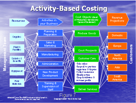 通過了解圖8,我們將以行動(dòng)成本管理大體是什么的總括作為結(jié)束。我們從左邊的成本驅(qū)動(dòng)因素開始——這是做工作的原因,例如:獲得客戶,維持客戶。就如圖4中所說的,這些成本驅(qū)動(dòng)因素可以細(xì)分到工作行動(dòng)上去?梢酝ㄟ^描述人,培訓(xùn),設(shè)備和技術(shù)資源來(lái)組成工作行動(dòng)。資源驅(qū)動(dòng)因素被用于分配這些企業(yè)成本到各個(gè)行動(dòng)上去。下一步就是系統(tǒng)地確定行動(dòng)驅(qū)動(dòng)因素,分配行動(dòng)成本到成本對(duì)象上去,這有利于決策的制定。例如,獲得一個(gè)客戶和維持一個(gè)客戶需要花費(fèi)多少的成本?