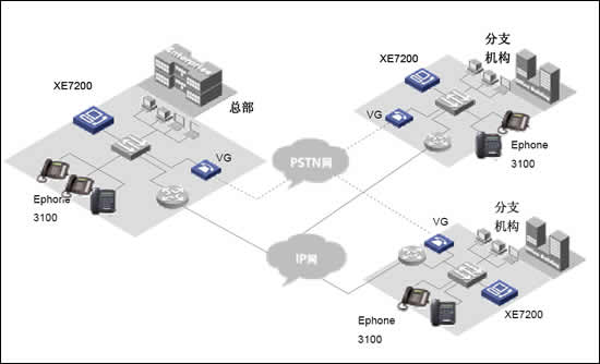 當企業(yè)存在多個大型分部的時候,如一個國際性公司。則可以在各個分部部署XE7000冗余方案,每個分部維護獨立的本地用戶信息。各小分支機構的IP語音終端可以直接注冊到本地XE7000上,從而實現(xiàn)整網的分布式部署。