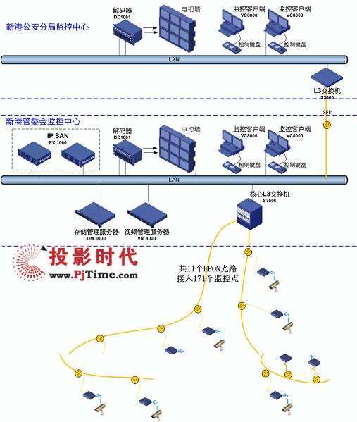 除了攝像頭與圖像顯示設(shè)備之外,整個監(jiān)控系統(tǒng)主要采用的都是H3C設(shè)備。系統(tǒng)用11(應(yīng)改成10條,最終只用了10條)條EPON光路接入全部171個監(jiān)控攝像頭;并采用專業(yè)的EX1000存儲產(chǎn)品為120T關(guān)鍵歷史視頻數(shù)據(jù)的提供了高可靠性的存儲保護(hù);而S7506、S3600交換機(jī)優(yōu)化的組播特性和特色的雙流技術(shù)則確保了所有監(jiān)控點(diǎn)的高清晰、高實(shí)時性、支持大量并發(fā)訪問。系統(tǒng)的集中管理、批量配置、全網(wǎng)網(wǎng)管也可以為新港開發(fā)區(qū)節(jié)省管理成本。