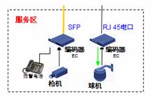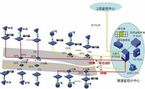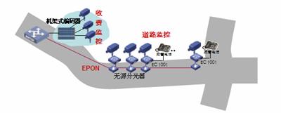 道路沿線監(jiān)控:采用EPON組網,路況監(jiān)控球機接入前端編碼器,多個編碼器通過一根EPON光纖接入到中心交換機上,布線方便節(jié)省光纖資源。編碼器內置交換機功能可以接入IP報警電話方便公路報警。還可以將支持IP接口的可變信號板和氣象站直接接入編碼器交換機端口,實現(xiàn)一網多用,降低整體網絡成本。