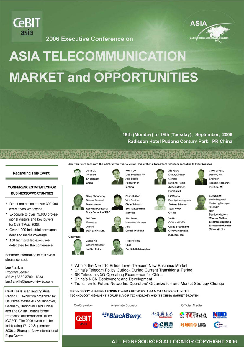2006亞洲信息及通信技術(shù)展覽會,即亞洲CeBIT展將于今年9月17日至20日在上海新國際博覽中心召開。由中國國際貿(mào)促會電子信息行業(yè)分會與德國漢諾威展覽公司聯(lián)合主辦的這一展會,近300家國內(nèi)外廠商參展,將分為數(shù)字設(shè)備及系統(tǒng)、商務(wù)應(yīng)用、通信三大展區(qū),多方位展現(xiàn)ICT行業(yè)的最新趨勢,并成為業(yè)內(nèi)廠商的專業(yè)貿(mào)易平臺。本次CeBIT展會期間(9月18、19日兩天),將在浦東證大麗笙酒店召開“2006亞洲通信及信息市場管理層論壇”。包括中國國家信息產(chǎn)業(yè)部、中國電信、韓國SK電訊、BDA中國等多家政府機(jī)關(guān)、運(yùn)營商、制造商將參加本次論壇,并做重要發(fā)言。