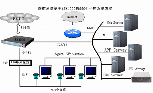 通過(guò)8個(gè)120路的分流器從iSX4000的中繼接口引入960路的坐席話(huà)機(jī)(或者坐席卡),單臺(tái)iSX4000能接入960路外部線(xiàn)路和960個(gè)內(nèi)部坐席。