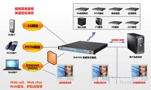 基于毅航通信ISX4000多媒體交換機(jī)的IVVR或視頻呼叫中心系統(tǒng)平臺(tái)可同時(shí)支持3G網(wǎng)絡(luò)、2G以及Internet網(wǎng)絡(luò)的接入;支持視頻、語音、傳真、郵件、短信等全方位服務(wù)模式;支持集中和IP分布式部署,座席數(shù)隨時(shí)隨地任意伸縮,可輕松形成一個(gè)跨區(qū)域、集語音和視頻于一體、統(tǒng)一的視頻呼叫中心系統(tǒng)。