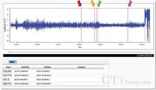關(guān)鍵詞組字符串設(shè)定,可透過系統(tǒng)調(diào)配建置學(xué)習(xí)性的語料庫,當(dāng)收集可比對的關(guān)鍵詞錄音數(shù)量具規(guī)模時,可達(dá)到一定的辨識度信心水平,同時透過Web錄音調(diào)閱畫面,在撥放符合關(guān)鍵詞音檔時,可提供標(biāo)示、注記、搜尋功能及音文件波形呈現(xiàn)關(guān)鍵詞的落點以及情緒分析變化,有效管理呼叫中心的關(guān)鍵議題,降低客訴率,提升客戶滿意及服務(wù)水平。
