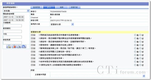 呼叫中心質(zhì)量管理最重要的工作之一,就是評核各類型業(yè)務(wù)電話服務(wù)的質(zhì)量。為了要做到公平與公正,質(zhì)檢樣本的篩選不只要相同業(yè)務(wù)服務(wù)內(nèi)容,更要相同的 環(huán)境條件,例如:不同業(yè)務(wù)類別(成交電話篩選、抱怨電話篩選)、日期(尖峰日電話篩選、離峰日電話篩選)提供公平的選擇基礎(chǔ)作為評核的樣本,不因隨機(jī)取樣造成對客服人員整體績效評估失之偏頗。即便呼叫中心因應(yīng)企業(yè)策略產(chǎn)生新的業(yè)務(wù)服務(wù)時,QMS8100KS可充分整合前端應(yīng)用系統(tǒng)的改變,可依據(jù)所需的篩選條件組合或與CTI整合后的篩選字段,完成交叉錄音檔案篩選。