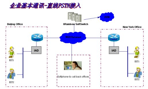 此方案主要適用于采用直線PSTN接入的企業(yè)用戶,有些小型企業(yè)由于公司處于建立初期或員工人數(shù)較少,所以沒(méi)有接入傳統(tǒng)的小型交換機(jī),而是直接使用直線電話線路接入。這樣的企業(yè)一般都迫切需要降低公司成本,提高客戶服務(wù)質(zhì)量,來(lái)提高公司的客戶形象。我們針對(duì)小型企業(yè)前期投資小的特點(diǎn),推薦企業(yè)前期使用IAD設(shè)備來(lái)解決企業(yè)話務(wù)問(wèn)題。小型企業(yè)分支機(jī)構(gòu)少,企業(yè)內(nèi)部通訊需求小,主要話務(wù)需求在撥打國(guó)內(nèi)國(guó)際長(zhǎng)途業(yè)務(wù)上。采用IAD設(shè)備既節(jié)省了費(fèi)用,也達(dá)到了企業(yè)發(fā)展的需求。彩虹電信還有自己開(kāi)發(fā)的軟終端,在家里或移動(dòng)辦公時(shí)可以方便使用。