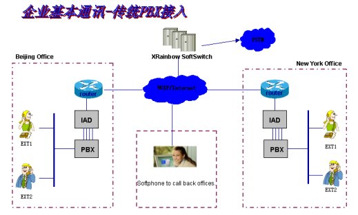 此方案主要適用于采用傳統(tǒng)交換機(jī)(PBX)的方式接入的企業(yè)用戶,有些企業(yè)已經(jīng)購(gòu)買(mǎi)傳統(tǒng)交換機(jī)(PBX)實(shí)現(xiàn)了集團(tuán)電話的功能,每個(gè)員工都有自己的分機(jī)號(hào)碼,大家可以用“9+本地號(hào)碼”來(lái)?yè)艽虮镜厥性。由于這些企業(yè)人員比較多如果每個(gè)員工桌面都安裝一個(gè)網(wǎng)絡(luò)話機(jī)或IAD,成本也會(huì)大幅度上升。所以我們結(jié)合傳統(tǒng)PBX給出了這個(gè)方案,將帶有FXS口的IAD網(wǎng)關(guān)接入到PBX的前端,IAD注冊(cè)到運(yùn)營(yíng)的軟交換平臺(tái)上,然后設(shè)置員工撥“8+長(zhǎng)途號(hào)碼”撥打國(guó)內(nèi)、國(guó)際長(zhǎng)途電話,采用VOIP技術(shù)降低了1/3的通訊費(fèi)用。這樣既保留了原來(lái)的撥號(hào)方式,不改變客戶習(xí)慣,又解決了企業(yè)基本通訊問(wèn)題。彩虹電信還有自己開(kāi)發(fā)的軟終端,在家里或移動(dòng)辦公時(shí)可以方便使用。