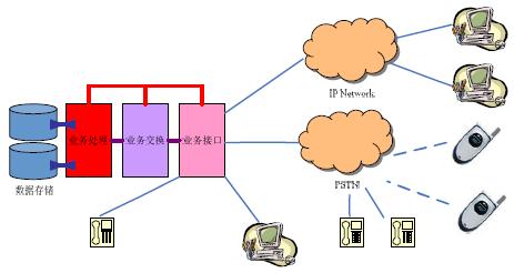 其中,業(yè)務(wù)接口部分為呼叫中心提供面向服務(wù)服務(wù)對(duì)象(客戶(hù))的連接和面向服務(wù)者(座席)的連接接口,業(yè)務(wù)交換部分負(fù)責(zé)在請(qǐng)求服務(wù)的對(duì)象與提供服務(wù)提供者之間建立連接,業(yè)務(wù)處理部分負(fù)責(zé)對(duì)這些連接及服務(wù)內(nèi)容進(jìn)行管理和維護(hù),數(shù)據(jù)存儲(chǔ)部分則為所有服務(wù)提供必要的數(shù)據(jù)資源和數(shù)據(jù)備份。