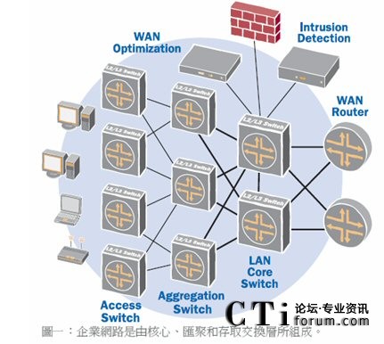 復(fù)雜的網(wǎng)絡(luò)拓?fù)?/b>:網(wǎng)絡(luò)架構(gòu)因內(nèi)含龐雜的多層網(wǎng)絡(luò),而變得越來越復(fù)雜。目前多數(shù)企業(yè)網(wǎng)絡(luò)都是三層式拓?fù)洌〝?shù)據(jù)匯聚層或分發(fā)層。許多網(wǎng)絡(luò)都已部署了匯聚交換機(jī),以彌補(bǔ)傳統(tǒng)存取及核心交換機(jī)欠缺高速光纖接口的缺陷,以便支持直接的連接。有些企業(yè)甚至建立了第四層網(wǎng)絡(luò),由連接到核心交換機(jī)的核心路由器組成。這樣的網(wǎng)絡(luò)架構(gòu)雖然可以發(fā)揮一定的作用,但卻大幅增加了資本支出,造成操作流程過于復(fù)雜,并為管理帶來沉重負(fù)擔(dān)。此外,這類架構(gòu)也會(huì)增加網(wǎng)絡(luò)的等待時(shí)間,并導(dǎo)致超額負(fù)載的情況出現(xiàn),因而降低了應(yīng)用效能。