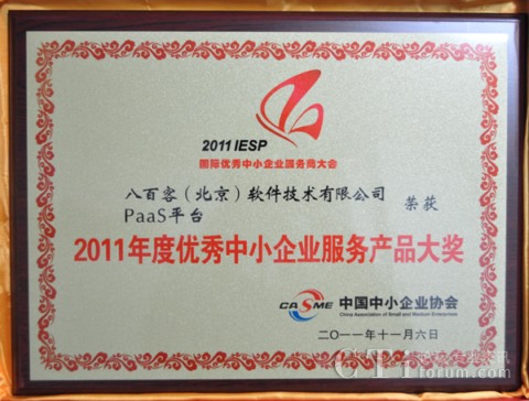 作為國(guó)內(nèi)首家SaaS廠商,八百客積極推動(dòng)云計(jì)算在中小企業(yè)中的宣傳與運(yùn)用。2006年,八百客在國(guó)內(nèi)率先推出管理自動(dòng)化開發(fā)平臺(tái)800APP, 它擴(kuò)展了按需服務(wù),并實(shí)現(xiàn)了客戶可根據(jù)需要自定制應(yīng)用程序,成為了改變應(yīng)用程序開發(fā)的一個(gè)新途徑。為表彰八百客在中小企業(yè)信息化中做出的杰出貢獻(xiàn),本次大會(huì)特別為八百客頒發(fā)了“2011年度優(yōu)秀中小企業(yè)服務(wù)產(chǎn)品大獎(jiǎng)”,此外還授予八百客總經(jīng)理李智 “2011年度優(yōu)秀中小企業(yè)服務(wù)明星大獎(jiǎng)”。