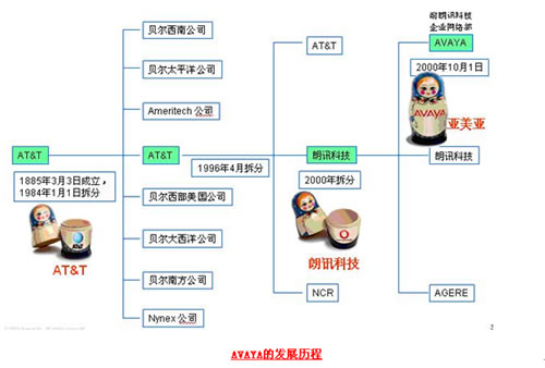Avaya的歷史最早可以追溯到1885年成立的美國(guó)電話(huà)電報(bào)公司(AT&T),AT&T在1994年一分為AT&T、朗訊科技、NCR等三家公司,而Avaya于2000年10月從朗訊科技的企業(yè)通信部門(mén)剝離獨(dú)立上市(代碼AV),再后來(lái)即上文中提到的Avaya被兩大私募德州太平洋集團(tuán)和銀湖合伙組成的財(cái)團(tuán)用82億美元私有化。