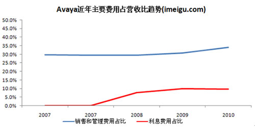銷(xiāo)售和管理費(fèi)用以及利息費(fèi)用是Avaya開(kāi)支最大的兩塊費(fèi)用,管理和銷(xiāo)售費(fèi)用一直穩(wěn)定在30%左右。Avaya私有化之前的2006、2007財(cái)年的利息費(fèi)用分別為300萬(wàn)美元、100萬(wàn)美元(對(duì)應(yīng)著51.48億美元和52,78億美元的營(yíng)收),利息費(fèi)用占比不到1%,私有化之后利息費(fèi)用急劇飆升(私有化相關(guān)債務(wù)的增加),2008、2009、2010財(cái)年利息費(fèi)用分別為3.77億美元、4.09億美元、4.87億美元,成為束縛Avaya盈利的關(guān)鍵因素。