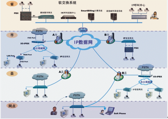 在各級辦公機構根據原有用戶數(shù)量,可以配置IP電話綜合接入設備或IP-PBX,連接當?shù)卦械霓k公電話環(huán)境(程控電話交換機、直線市話、電信虛擬網等)。實現(xiàn)機構內部辦公電話/傳真通過IP數(shù)據網通信。同時機構以外的長途電話/傳真也可以利用IP電話網傳輸,而不產生任何長途通信費用。