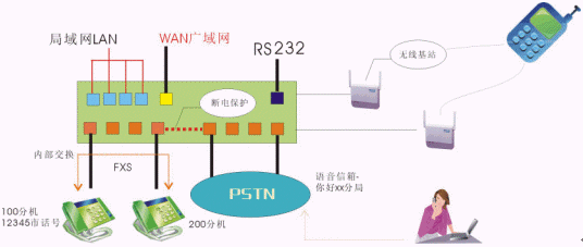 - 同時接入PSTN和專網電話,并在網關上實現(xiàn)內部交換、語音信箱、和PSTN交換等功能