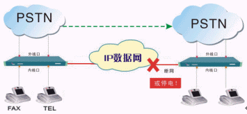 IP數(shù)據網故障或設備斷電時,呼叫可自動跳轉到PSTN市話網,同時播放語音告警。