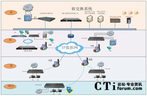 IP電話系統(tǒng)項目方案設計共分省、地州市、縣(市)三級進行部署,按照省集團至地州市分集團、縣(市)級分集團及營業(yè)廳建設,全網(wǎng)通過部署相應的IP電話設備(含語音軟交換、接入網(wǎng)關、PC軟電話、網(wǎng)管軟件、計費軟件等),組建全省IP電話系統(tǒng)。