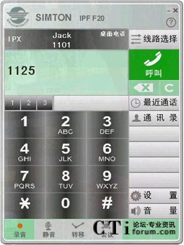 企業(yè)版需要另行購買,突出的功能包括“電子通信錄”、“軟電話與臺(tái)式電話機(jī)綁定”等!半娮油ㄓ嶄洝惫δ芤杨A(yù)裝在軟電話中,就像手機(jī)的通訊薄一樣。企業(yè)的員工不需要自己逐條輸入通訊錄,錄入與更新由企業(yè)的系統(tǒng)管理員在企業(yè)的通訊服務(wù)器上進(jìn)行,一人操作,全公司通訊錄同步更新。一個(gè)集團(tuán)公司或政府機(jī)構(gòu)有成百上千個(gè)員工很正常,但要讓大家記住這幾百個(gè)電話號(hào)碼就很困難了,目前較為常見的解決辦法有以下幾種,小一點(diǎn)的企業(yè)或機(jī)構(gòu)通常會(huì)打印一張通訊錄發(fā)放給每個(gè)員工,員工撥號(hào)前會(huì)先查一下這張通訊錄然后再將電話號(hào)碼在臺(tái)式辦公電話機(jī)上逐個(gè)輸入;規(guī)模大一點(diǎn)的企業(yè)會(huì)專門印制一本通訊薄發(fā)給每個(gè)員工,但由于機(jī)構(gòu)龐大,往往等到通訊簿發(fā)到手上,其中有很多電話號(hào)碼已經(jīng)不正確了。F20型軟電話的“與臺(tái)式電話機(jī)綁定”功能就很好的解決了這個(gè)問題,通過將電腦上的軟電話與辦公桌上的臺(tái)式電話機(jī)進(jìn)行綁定,企業(yè)中的所有員工在打電話時(shí),都可以先點(diǎn)擊電腦軟電話中的通訊錄,快速找到需要的電話號(hào)碼,然后只需點(diǎn)擊這個(gè)號(hào)碼條,這個(gè)員工的臺(tái)式電話機(jī)就會(huì)自動(dòng)向目標(biāo)電話進(jìn)行撥號(hào),待對(duì)方摘機(jī)后,這個(gè)員工的臺(tái)式電話機(jī)就會(huì)響起鈴聲,此時(shí)摘機(jī)就可進(jìn)行通話了。確實(shí)夠方便,夠?qū)嵱茫?