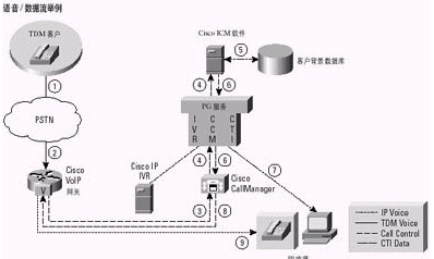 注意2:這一樣本語(yǔ)音/數(shù)據(jù)流描述了一個(gè)單地點(diǎn)IPCC實(shí)現(xiàn)。另外,可以將IPCC集成到一個(gè)多地點(diǎn)聯(lián)絡(luò)中心,并獲得ICM軟件所提供的可貫穿整個(gè)企業(yè)的、網(wǎng)絡(luò)級(jí)的路由預(yù)選功能所能帶來的好處。