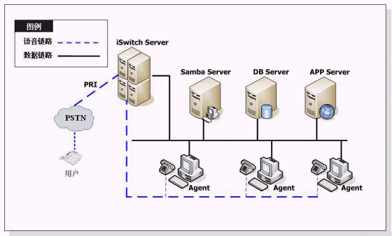 Samba Dialer®通過(guò)China ISDN PRI直接和PSTN連接,系統(tǒng)結(jié)構(gòu)如下圖所示: