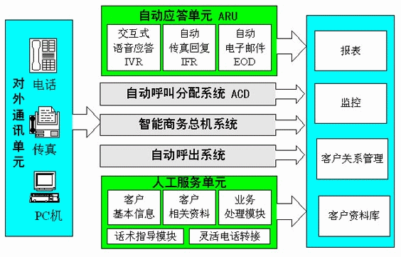 ACD(自動(dòng)呼叫分配)是呼叫中心有別于一般的熱線電話系統(tǒng)的重要部分,在一個(gè)呼叫中心中,ACD成批的處理來話呼叫,可根據(jù)用戶類別、客戶支持的忙閑統(tǒng)計(jì)、客戶支持的服務(wù)能力、不同時(shí)段、主叫用戶的號(hào)碼、該用戶曾聯(lián)絡(luò)過的客戶支持、客戶支持的專業(yè)技能等級(jí)等信息并將這些來話進(jìn)行分配給具有相關(guān)職責(zé)或技能的各個(gè)業(yè)務(wù)代理。ACD提高了系統(tǒng)的效率,減少了客戶服務(wù)中心系統(tǒng)的開銷,并使公司能更好的利用客戶資源。
