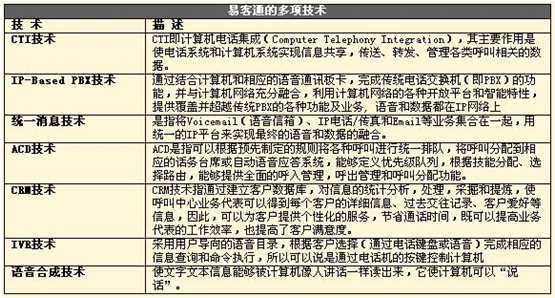 易客通將全套的語音、數(shù)據(jù)、互聯(lián)網(wǎng)服務(wù)和豐富的業(yè)務(wù)應(yīng)用整合到單個(gè)系統(tǒng)中(All-In-One),融合語音和數(shù)據(jù),以模塊化的形式提供各種功能(CRM、IVR、多媒體功能、錄音、報(bào)表、管理工具、客戶化產(chǎn)品定制開發(fā)工具、自動(dòng)外撥系統(tǒng)等),滿足不同用戶的需求,系統(tǒng)開放、可靠、易于擴(kuò)展和升級(jí),容易獲得和使用,一切都非常簡(jiǎn)單,可以從容應(yīng)對(duì)e時(shí)代企業(yè)通信系統(tǒng)所面臨的諸多復(fù)雜挑戰(zhàn)。