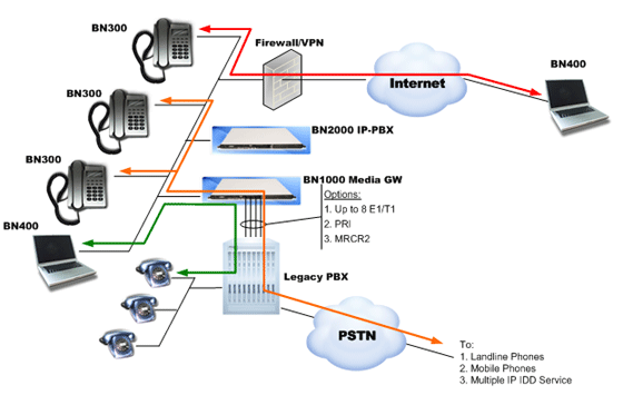 IP-PBX具有強(qiáng)大的動(dòng)態(tài)路由選擇功能。將BN2000IP-PBX與BN1000網(wǎng)關(guān)配合使用,傳統(tǒng)PBX管轄下的每個(gè)模擬電話就會(huì)變身為BN300