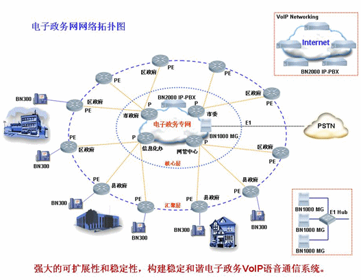 寶諾公司通過自主研發(fā),可提供整套基于開放的SIP標準協(xié)議的“SIPEverest”VoIP語音通信產(chǎn)品解決方案,來構(gòu)建穩(wěn)定和諧的VoIP語音電子政務網(wǎng)。組網(wǎng)拓撲圖: