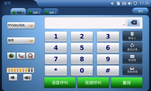 7寸大屏搭配寬大的數(shù)字虛擬鍵盤,讓你的撥號(hào)準(zhǔn)確無誤。同時(shí)界面的所顯示的通話功能諸如查找聯(lián)系人、查找通話記錄、發(fā)送短消息或者快速進(jìn)入語音信箱等功能也清晰明了。可以發(fā)現(xiàn)的是,用戶在輸完號(hào)碼之后可自主選擇采用語音呼叫還是視頻呼叫。另外,同潮流網(wǎng)絡(luò)之前的一款視頻電話GXV3140一樣的是,GXV3175也在出廠自帶了一個(gè)IPVideoTalk賬號(hào)。該賬號(hào)是出廠時(shí)就已配置好的,每一臺(tái)電話配備一個(gè)號(hào)碼并顯示在桌面上。也就是說,用戶在拿到GXV3175并聯(lián)網(wǎng)之后即可使用該賬號(hào)撥打免費(fèi)的視頻電話了。這可是很多廠商所沒有的特殊功能。下面我們就使用隨機(jī)附送的IPVideoTalk賬號(hào)來撥打視頻電話。