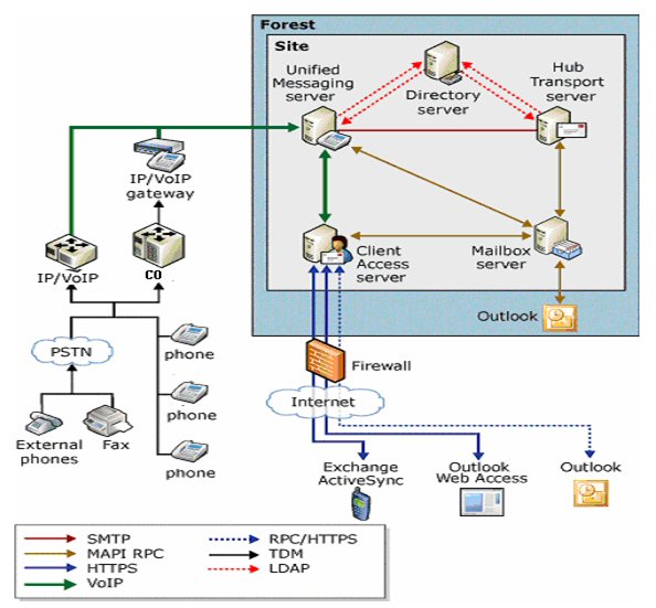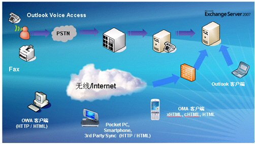 客戶端可以通過(guò)Outlook,Web,固話語(yǔ)音和手機(jī)接入,查看相關(guān)的郵件以及日程安排等信息。如下圖: