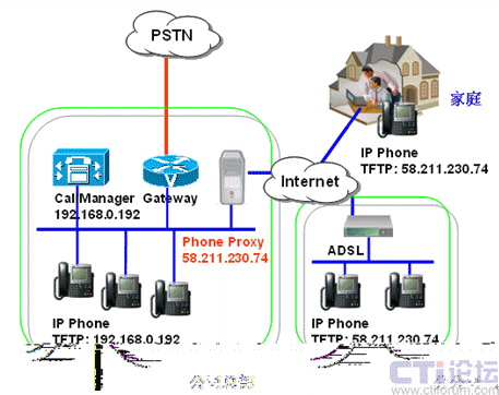 PCS的PhoneProxy是一套軟件,只要在中心CallManager站點(diǎn)安裝一套PhoneProxy,就能實(shí)現(xiàn)任何能上網(wǎng)的地方,IP電話都能通過廣域網(wǎng)注冊(cè),不需要任何VPN設(shè)備。