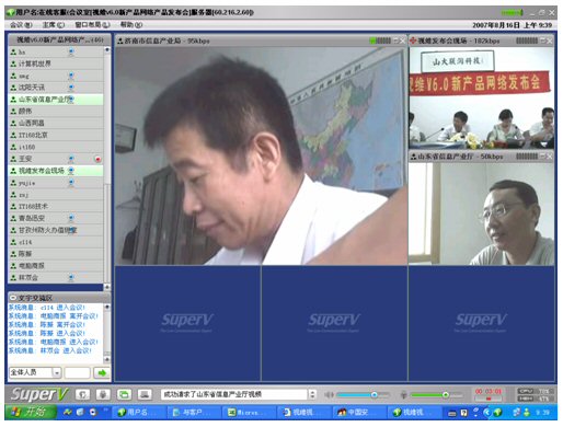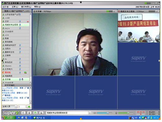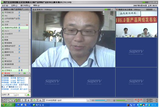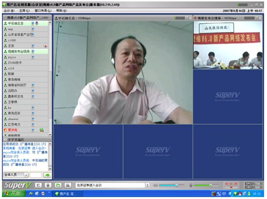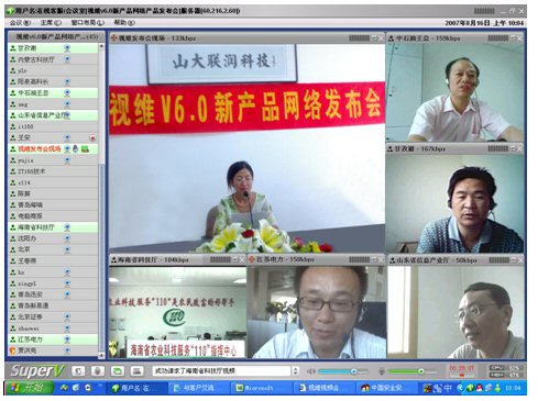 2007年8月16日,視維視頻會(huì)議V6.0新產(chǎn)品網(wǎng)絡(luò)發(fā)布會(huì)在美麗的泉城濟(jì)南舉行,山東省信息產(chǎn)業(yè)廳、濟(jì)南市信息產(chǎn)業(yè)局的領(lǐng)導(dǎo)、山東省電信等上級(jí)主管部門(mén)領(lǐng)導(dǎo),視維產(chǎn)品新老用戶和有視頻會(huì)議需求的潛在客戶,國(guó)內(nèi)外合作伙伴,IT168、中國(guó)計(jì)算機(jī)報(bào)、電腦商報(bào)、C114、支點(diǎn)網(wǎng)、計(jì)算機(jī)世界、CTI論壇、投影時(shí)代等國(guó)內(nèi)知名媒體100多人參加了這次網(wǎng)絡(luò)發(fā)布會(huì)。在此次會(huì)議上,山大聯(lián)潤(rùn)公司通過(guò)視頻會(huì)議與各地與會(huì)者進(jìn)行了良好的溝通,同時(shí)這次發(fā)布會(huì)開(kāi)創(chuàng)了用視頻會(huì)議發(fā)布新產(chǎn)品的先河。
