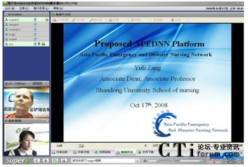 視維視頻會(huì)議系統(tǒng)良好的兼容性,使亞太地區(qū)各成員國(guó)的代表雖遠(yuǎn)隔千山萬水,依然可以實(shí)現(xiàn)無限溝通。視維視頻會(huì)議系統(tǒng)所提供的清晰流暢的音視頻使各成員國(guó)的代表無需走出國(guó)門,無需聚到一起,就可以輕松地網(wǎng)絡(luò)面對(duì)面的進(jìn)行交流,既可節(jié)約差旅費(fèi)用,又可避免舟車勞頓之苦,是各國(guó)代表有更多精力投入到工作中;視維的共享白板、共享文檔、文件下載等強(qiáng)大的數(shù)據(jù)協(xié)作功能可以使各國(guó)代表快速地共享更多的信息、資料,及時(shí)地開展越洋培訓(xùn)。近日網(wǎng)絡(luò)面對(duì)面地討論第三屆APEDNN的進(jìn)程及各項(xiàng)議題就是一次典型的應(yīng)用之一,不僅節(jié)約了差旅和時(shí)間成本,而且提高了工作效率,拉近世衛(wèi)各成員國(guó)之間的距離,天涯若比鄰,是各國(guó)代表在工作上更為默契,提高人類應(yīng)對(duì)突發(fā)事件與災(zāi)害的能力。