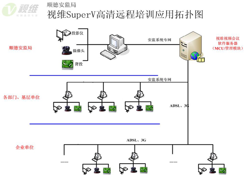 順德安監(jiān)局各部門及下屬單位使用安監(jiān)系統(tǒng)專網(wǎng)進行連接,而重點培育企業(yè)網(wǎng)絡情況復雜,涉及ADSL以及3G無線網(wǎng)絡等多種情況,視維根據(jù)順德安監(jiān)局、局下屬單位及重點培育企業(yè)的分布情況,將服務器架設在順德安監(jiān)局總部,并在總部搭建會議室和培訓中心,其他各部門、下屬單位和重點培育企業(yè)為分會場。
