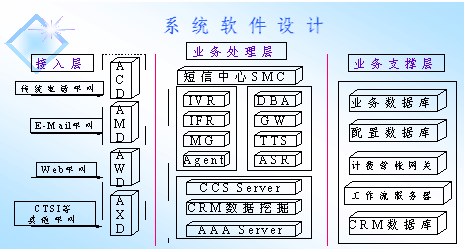 由于企業(yè)呼叫中心不僅面臨的服務(wù)對象多(包括已有的和潛在的最終客戶、維修中心等等),而且將來提供的業(yè)務(wù)種類也會多且復(fù)雜,將來還要進一步和企業(yè)內(nèi)部的其他如ERP、CRM等這樣的系統(tǒng)接口,這必然會導(dǎo)致整個系統(tǒng)中對于數(shù)據(jù)的訪問和管理的要求會很高。而我們在這方面提供了很好的解決方案,從數(shù)據(jù)的整理、錄入、修改到訪問都非常方便。由于采用了三層Client/Server的數(shù)據(jù)訪問方式,通過中間層屏蔽掉了各種數(shù)據(jù)庫之間的差異,使得系統(tǒng)對于各種內(nèi)外部數(shù)據(jù)的訪問都變得非常簡單,對于將來增加新的數(shù)據(jù)源,或者是與新的系統(tǒng)進行連接也會非常容易