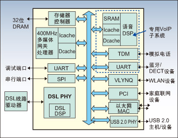 圖2演示了這種架構(gòu)的一個例子,即一款帶集成ADSL和VDSL2寬帶連接功能的SoC。該SoC具有一個工作在400MHz頻率的多媒體網(wǎng)關處理器,性能比以前產(chǎn)品提升了一倍。附加的硬件加速器和32位寬的存儲器接口進一步提升了該網(wǎng)關的聯(lián)網(wǎng)能力。