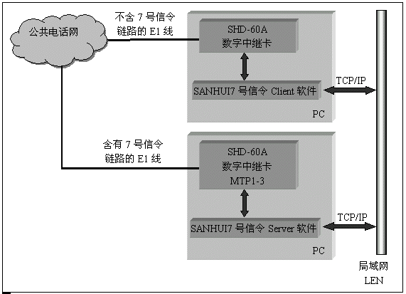 數(shù)字中繼卡上的DSP完成7號信令MTP第一至第三層的信令鏈路處理,由驅(qū)動(dòng)軟件完成TUP和ISUP層的協(xié)議處理,包含有7號信令鏈路的微機(jī)作為server,通過TCP/IP協(xié)議為其它不包含信令鏈路的client提供接續(xù)控制。