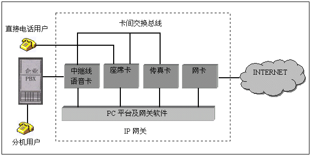 在PC機(jī)平臺內(nèi),可插入三種不同類型的語音卡,中繼卡用于連接企業(yè)原有的用戶交換機(jī),使得分機(jī)用戶可以通過IP網(wǎng)絡(luò)接打電話,中繼線可采用模擬線或數(shù)字中繼線、座席卡用于直接連接電話用戶,常用于沒有用戶交換機(jī)的場合;傳真卡用于完成IP網(wǎng)絡(luò)上的傳真中繼功能。所有的語音卡之間采用卡間交換總線相連,以便實(shí)現(xiàn)互相通話和傳真資源共享。PC平臺內(nèi)一般還需要網(wǎng)卡實(shí)現(xiàn)與INTERNET的連接。網(wǎng)關(guān)軟件是該IP網(wǎng)關(guān)的關(guān)鍵部分,完成對語音卡的控制和IP協(xié)議處理。