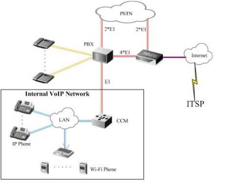 iBG3026,最后在PBX和Ubigate iBG3026之間再開通4條E1中繼,同時,Ubigate iBG3026通過自帶的GE接口接入酒店的辦公局域網(wǎng),這樣即使出現(xiàn)客房人員使用網(wǎng)絡(luò)不規(guī)范的情況發(fā)生,也不會影響語音服務(wù)的質(zhì)量。