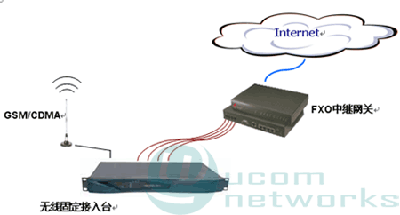 本方案采用FXO中繼語音網(wǎng)關(guān)接入互聯(lián)網(wǎng),由當(dāng)?shù)仄胀M電話線路落地對接網(wǎng)關(guān)FXO口,采用電話卡綁定網(wǎng)關(guān)預(yù)付費(fèi)計費(fèi)實(shí)現(xiàn)運(yùn)營。落地線路接入可以使用本地固定PSTN線路,也可以轉(zhuǎn)制無線電話,采用固定臺接入,2種拓?fù)鋱D如下所示。