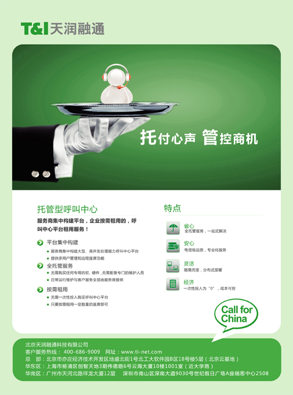北京天潤(rùn)融通科技有限公司致力于為企業(yè)提供簡(jiǎn)單、易用、可依靠的托管型呼叫中心服務(wù),幫助企業(yè)更好地經(jīng)營(yíng)其客戶資源。天潤(rùn)融通是國(guó)內(nèi)呼叫中心領(lǐng)域內(nèi)領(lǐng)先的“云應(yīng)用”提供者。先后承接了百度全國(guó)客服中心、平安保險(xiǎn)北京客服中心、慧聰網(wǎng)呼叫中心、央視網(wǎng)絡(luò)客服中心、安博教育客服中心、圓通快遞客戶服務(wù)中心、飯統(tǒng)網(wǎng)客戶訂餐中心等大型的呼叫中心項(xiàng)目。服務(wù)的客戶遍及互聯(lián)網(wǎng)、教育培訓(xùn)、金融服務(wù)、旅游票務(wù)、電子商務(wù)、食品飲料、醫(yī)療保健、消費(fèi)品制造和銷(xiāo)售、物流、餐飲娛樂(lè)、電視購(gòu)物等十多個(gè)領(lǐng)域達(dá)數(shù)千家企業(yè)客戶。