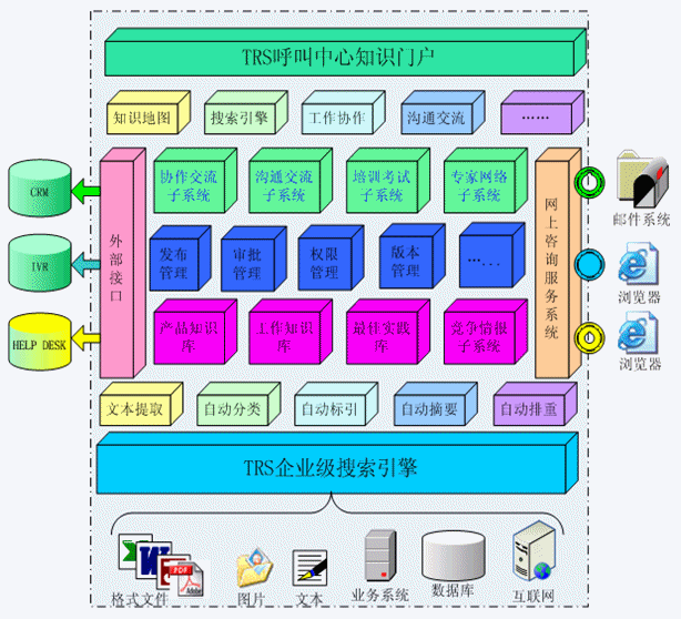 TRS Call Center 知識(shí)管理系統(tǒng)構(gòu)建在TRS企業(yè)級(jí)搜索引擎之上,融合了TRS文本挖掘技術(shù)和內(nèi)容管理技術(shù),全面包括知識(shí)庫(kù)、競(jìng)爭(zhēng)情報(bào)、專(zhuān)家網(wǎng)絡(luò)、培訓(xùn)考試、溝通交流和協(xié)作交流六大子系統(tǒng),以及發(fā)布管理、審批管理、權(quán)限管理、版本控制等系統(tǒng)管理模塊;并集成面向用戶的網(wǎng)上咨詢服務(wù)系統(tǒng),提供面向客戶管理信息系統(tǒng)(CRM)、自動(dòng)語(yǔ)音應(yīng)答系統(tǒng)(IVR)、Help