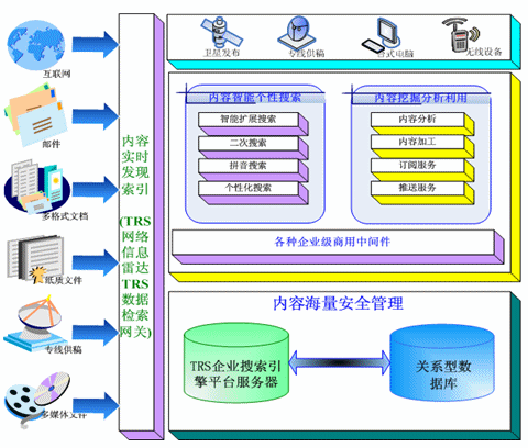 TRS公司推出的企業(yè)搜索引擎解決方案,利用TRS公司多年來自主開發(fā)的TRS Database Server作為企業(yè)搜索引擎服務(wù)的平臺(tái)?梢詫㈦娦牌髽I(yè)內(nèi)外部多種格式、多種介質(zhì)形態(tài)、多種存儲(chǔ)方式的內(nèi)容信息,以實(shí)時(shí)的方式將這些信息進(jìn)行索引。并且在索引的過程中力求能夠做到準(zhǔn)確,并配合以相關(guān)智能語言技術(shù)做信息的去重、自動(dòng)標(biāo)引等能力。其框架如圖: