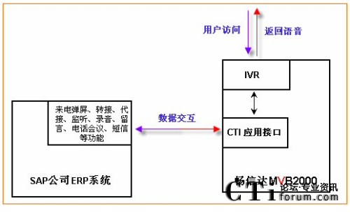 通過集成,不但可以實(shí)現(xiàn)與SAP公司ERP系統(tǒng)的實(shí)時(shí)數(shù)據(jù)傳輸,實(shí)現(xiàn)客戶管理、日常辦公,并且可使ERP系統(tǒng)上具有:點(diǎn)擊外呼、批量外呼、來電彈屏、收聽錄音、查看報(bào)表、監(jiān)控電話線路等更多增值功能,詳細(xì)接口內(nèi)容見《MVB2000 WEB開發(fā)接口》。