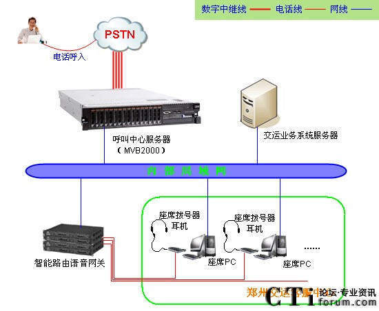 鄭州交運服務(wù)熱線采用暢信達(dá)通信MVB2000系統(tǒng)作為交換平臺,采用企業(yè)級智能路由語音網(wǎng)關(guān)結(jié)合話機(jī)作為座席終端,系統(tǒng)共接入數(shù)字中繼線4條(4E1),座席分機(jī)90臺,系統(tǒng)通過內(nèi)部局域網(wǎng)組網(wǎng),系統(tǒng)架構(gòu)形式如下: